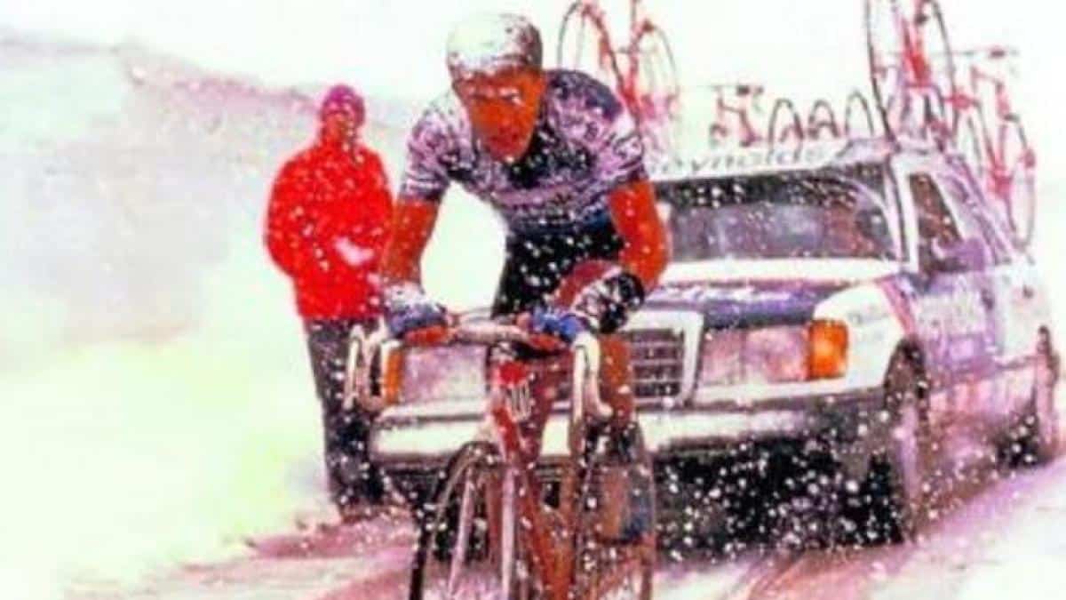 ‘Perico’ Delgado castigado por la nieve en el Gavia. Puede ser la primera de las etapas más duras en la historia del ciclismo.