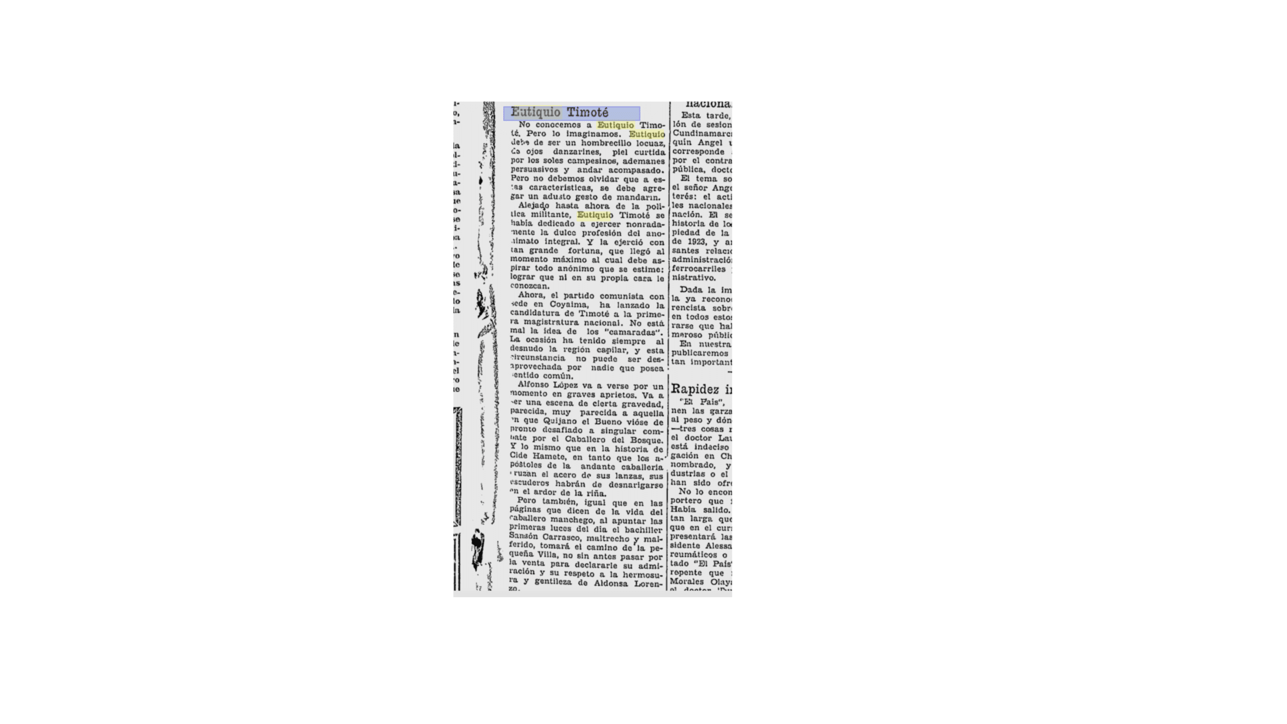Después vino la sátira. En su sección Cosas del día, El Tiempo dice no conocer a Timoté, pero igual lo imagina y lo llama un “hombrecillo locuaz”, de “ojos danzarines”, “piel curtida por los soles campesinos” y hasta con “adusto gesto de mandarín”. Añade que hasta entonces había ejercido la “dulce profesión del anonimato integral” y lamenta que la haya cambiado por la política. No discute sus ideas ni su trayectoria. Lo vuelve caricatura. Lo trata como personaje literario (El Quijote pijao) antes que como candidato.