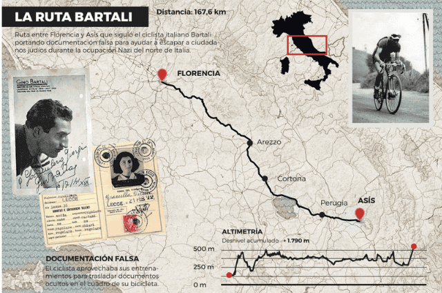Pero nada sería comparable a su trabajo para la resistencia contra los nazis, entre 1943 y 1944, cuando ayudó a salvar vidas de judíos perseguidos por los alemanes. Durante esta peligrosa tarea, Bartali haría su propio Giro llegando a varias ciudades de la bota itálica, como Asís, Florencia, Génova, Lucca o Ciudad del Vaticano.